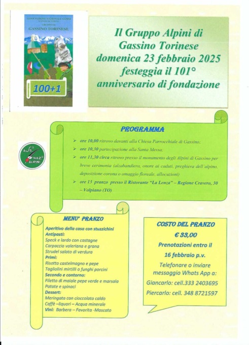 Dopo i grandi festeggiamenti per il centenario celebrato nel 2024, il gruppo Alpini di Gassino Torinese si prepara a commemorare il 101° anniversario dalla fondazione.