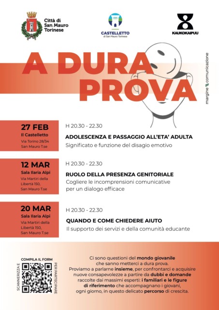 - Adolescenza e passaggio all’età adulta – Significato e funzione del disagio emotivo venerdì 27 febbraio, dalle 20.30 alle 22.30 al Castelletto di San Mauro Torinese, via Torino 28;