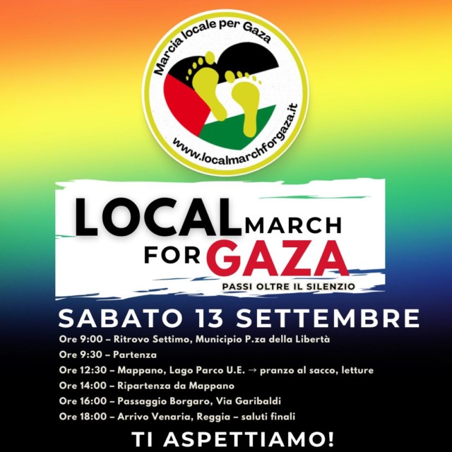 Il Coordinamento Comuni per la Pace (CoCoPa) di cui fa parte anche il comune di Settimo Torinese, la Sezione Guerrino Nicoli dell’ANPI cittadina e altre realtà del territorio invitano a partecipare alla Local March for Gaza, iniziativa di solidarietà internazionale che, partita lo scorso 10 luglio da Oropa, si concluderà a Roma.