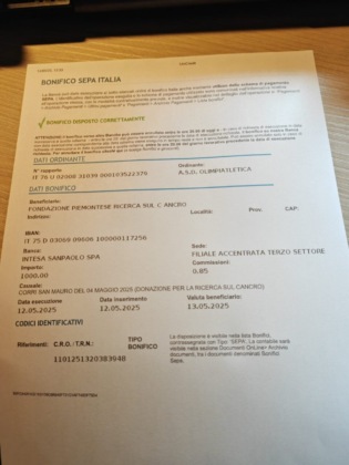 Come annunciato in fase di presentazione, 1 euro per ogni iscritto alla camminata ludico-motoria è stato destinato alla ricerca. La somma raccolta ha superato i 400 euro, e OlimpiAtletica, società organizzatrice, ha deciso di integrare l’importo fino a quota 1.000. Il bonifico è già stato effettuato a sostegno delle attività della Fondazione.