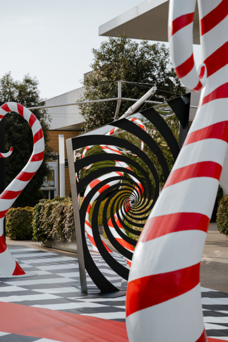 Protagoniste indiscusse dell’installazione le spirali di Tim Burton, che a tutti gli appassionati richiamano subito alla mente l’abbraccio fra Jack Skeletron e Sally in Nightmare Before Christmas.