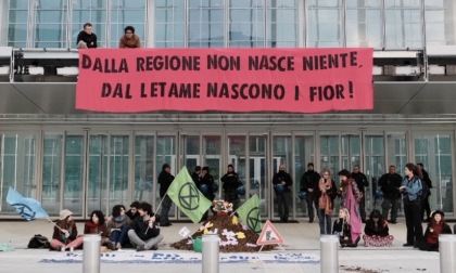 “Due persone si trovano tuttora – fanno sapere gli attivisti nella mattina di venerdì 31 marzo – sulla tettoia dell’ingresso. Al posto dell’insegna portata via dal vento qualche settimana fa, hanno appeso l’enorme scritta “Dalla regione non nasce niente, dal letame nascono i fiori”, parafrasando il celebre verso di Fabrizio De Andrè.
