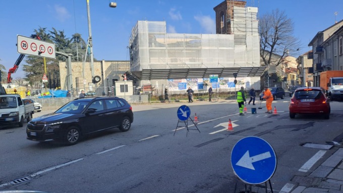 Da questa mattina gli operai del Comune, con la supervisione della Polizia locale, erano al lavoro per ridisegnare la segnaletica e predisporre l’area al posizionamento della rotonda provvisoria.