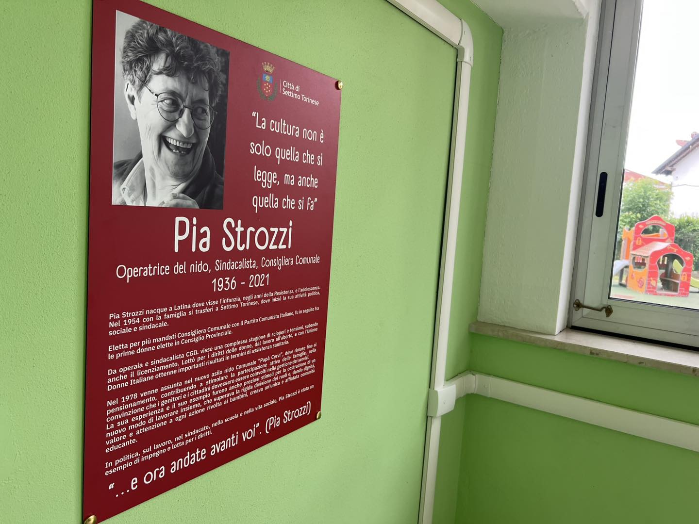Nata a Latina, Pia Strozzi si trasferì a Settimo nel 1954 e fu protagonista della scena politica e sindacale cittadina e provinciale, militante nel PCI, sindacalista CGIL e attivista per i diritti delle donne. Dal 1978 lavorò nell’asilo nido “Papà Cervi”, contribuendo a costruire una vera comunità educante, fondata sulla collaborazione tra educatori e famiglie.