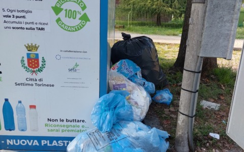 Non solo fuori dalle isole ecologiche: anche alcuni punti di conferimento delle bottiglie di plastica sono diventati depositi improvvisati per i sacchi della spazzatura.