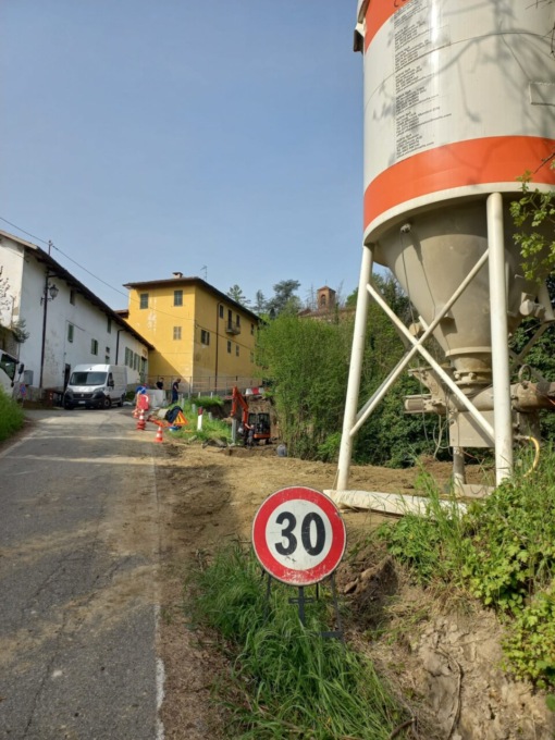 Lavori in corso per mettere in sicurezza la diramazione 1 della Strada Provinciale 97 di Cinzano tra il Km 0+800 e il Km 0+900.
