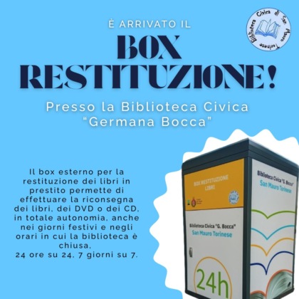 Restituire un libro anche di sera, nei weekend o nei giorni festivi? Da oggi a San Mauro Torinese si può. La Biblioteca Civica “Germana Bocca” ha infatti inaugurato un nuovo box di restituzione esterno, attivo 24 ore su 24, progettato per rendere più semplice e sicuro il rientro di volumi e materiali multimediali presi in prestito.