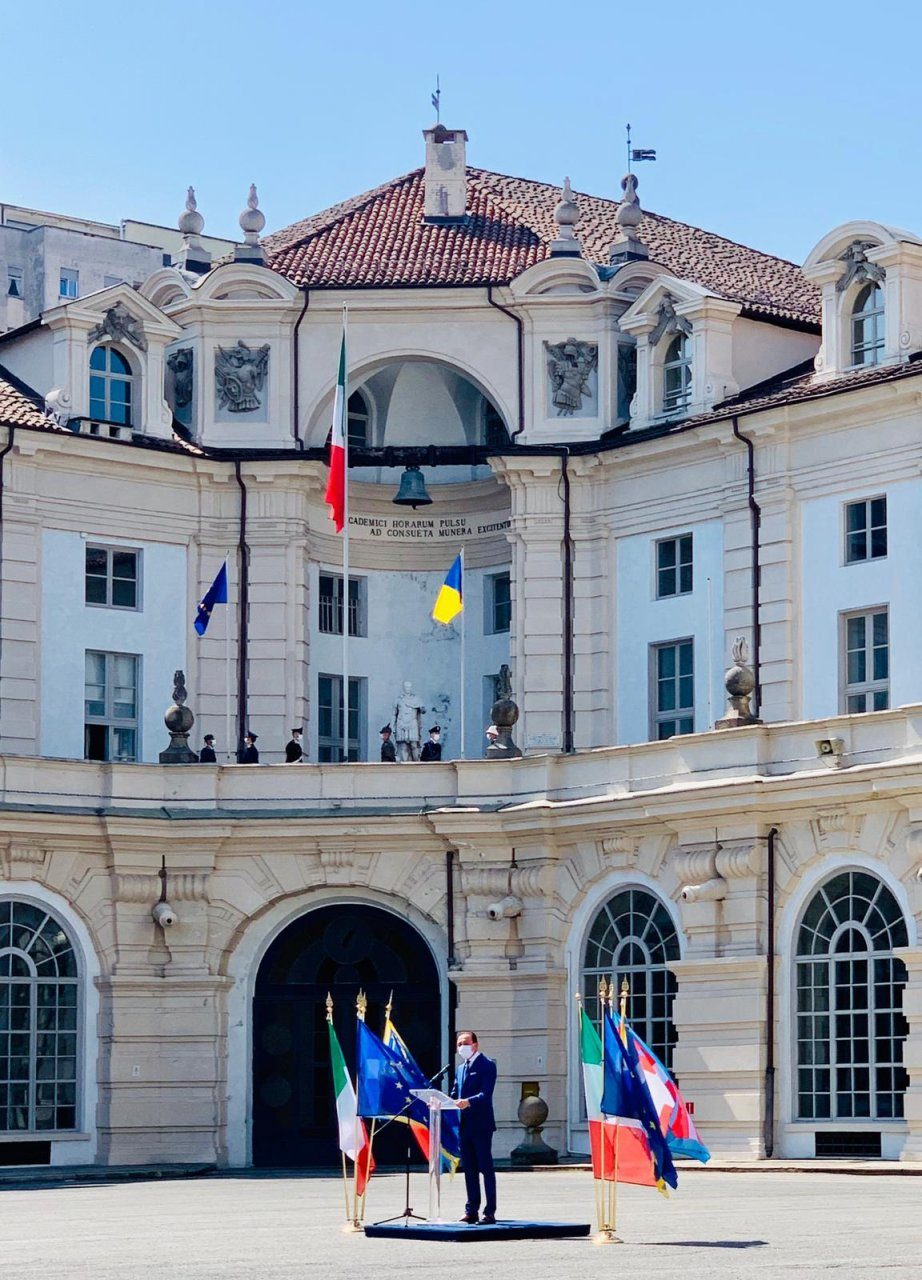 Questa mattina, martedì 2 giugno si sono svolte a Torino le celebrazioni Istituzionali in onore della Festa della Repubblica. I presidenti della Regione Piemonte Alberto Cirio e del Consiglio regionale Stefano Allasia sono intervenuti alla cerimonia dell’Alzabandiera in occasione della Festa della Repubblica tenutasi nel Cortile d’Onore del Comando per la Formazione e Scuola di Applicazione dell’Esercito di Torino.