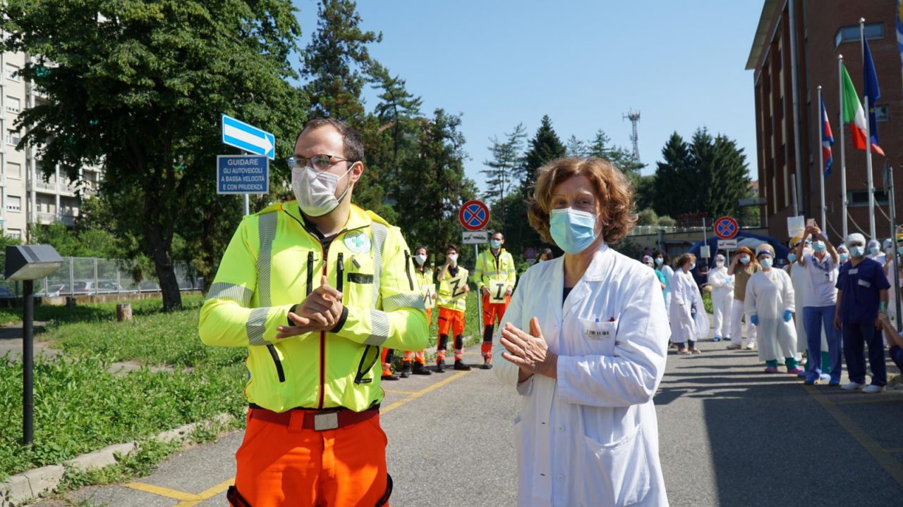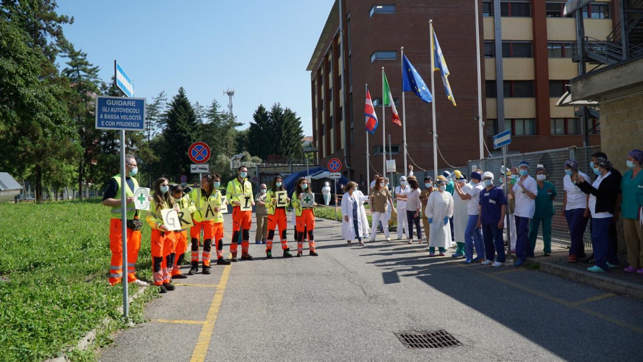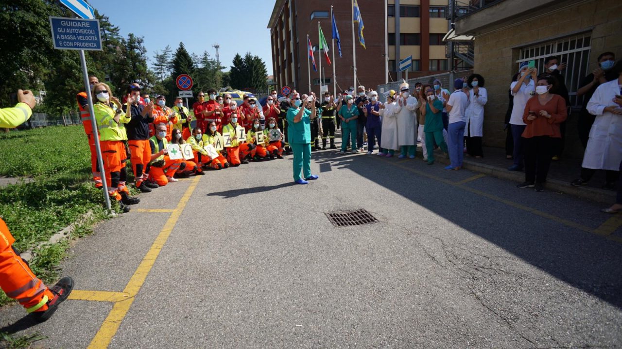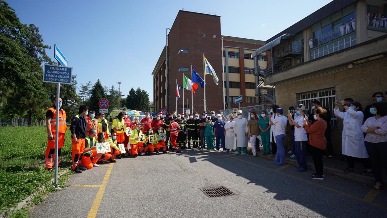 Per ringraziare il personale sanitario che è stato attivo in questi mesi i soccorritori hanno fatto un minuto di sirene spiegate e poi hanno fatto un ulteriore giro dell’isolato con le sirene per salutare i pazienti ed il personale che non è potuto scendere al flash mob.