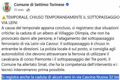 “La caduta di un albero al Villaggio Olimpia, che non ha provocato danni alle persone, e l’allagamento del sottopassaggio ferroviario di via Leini-via Cavour. Il sottopassaggio è chiuso in entrambe le direzioni. La polizia locale è sul posto, si consiglia agli automobilisti che devono attraversare la ferrovia di utilizzare il cavalcavia di corso Piemonte i il sottopassaggio dei Tre ponti. Il Comune ha allertato Smat, che ha la competenza dell’intervento e i tecnici interverranno prima possibile”.