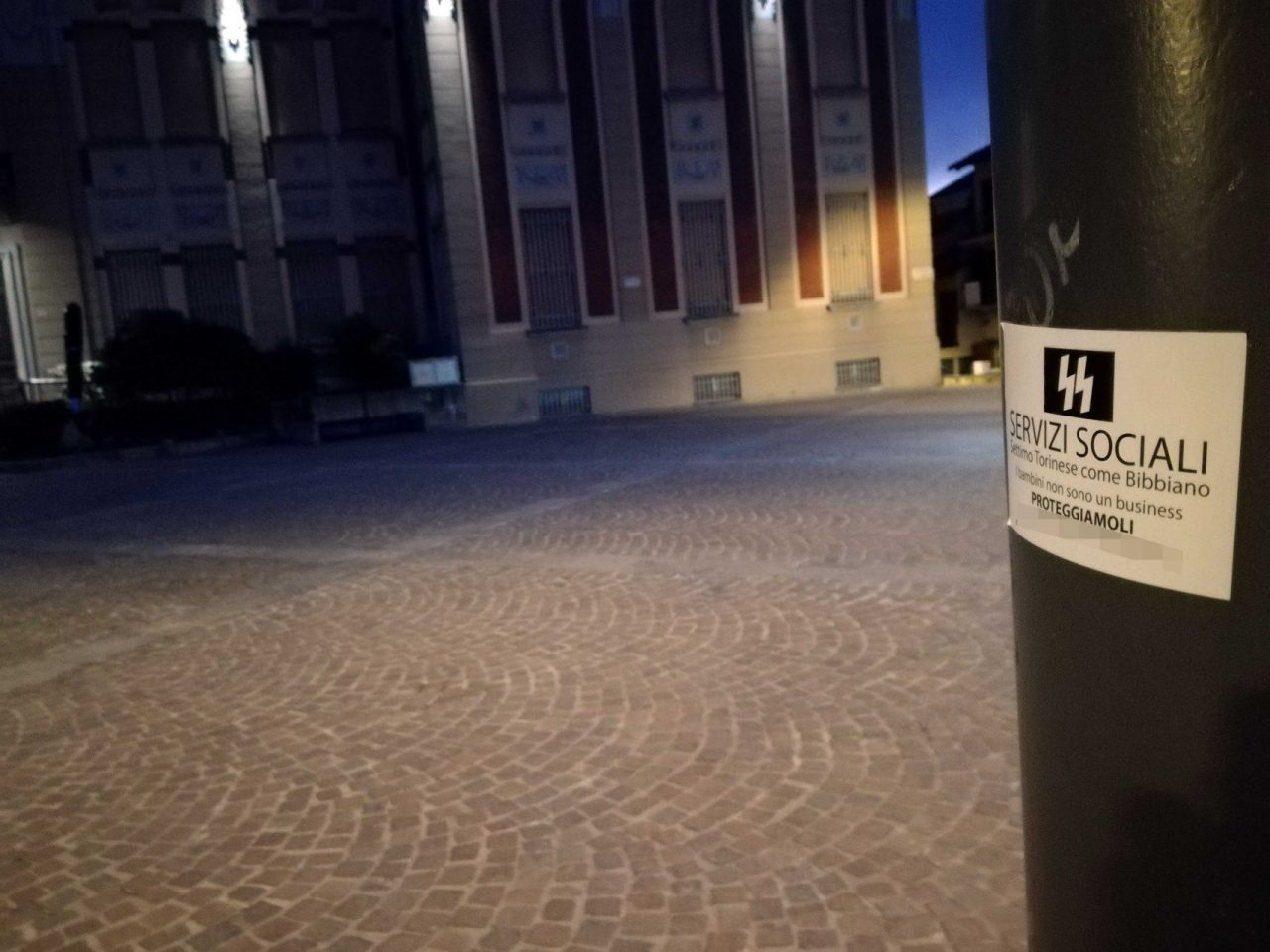 Il logo delle SS, Waffen-SS, tristemente note nella Germania nazista della seconda guerra mondiale, campeggia su un adesivo che da ieri – martedì 4 febbraio – è stato affisso su pali, cassette della posta e paline delle fermate dei pullman di tutto il centro storico settimese. Una denuncia, pesante, indirizzata ai servizi sociali operativi nella città di Settimo che, appunto, vengono paragonati a quelli di Bibbiano.