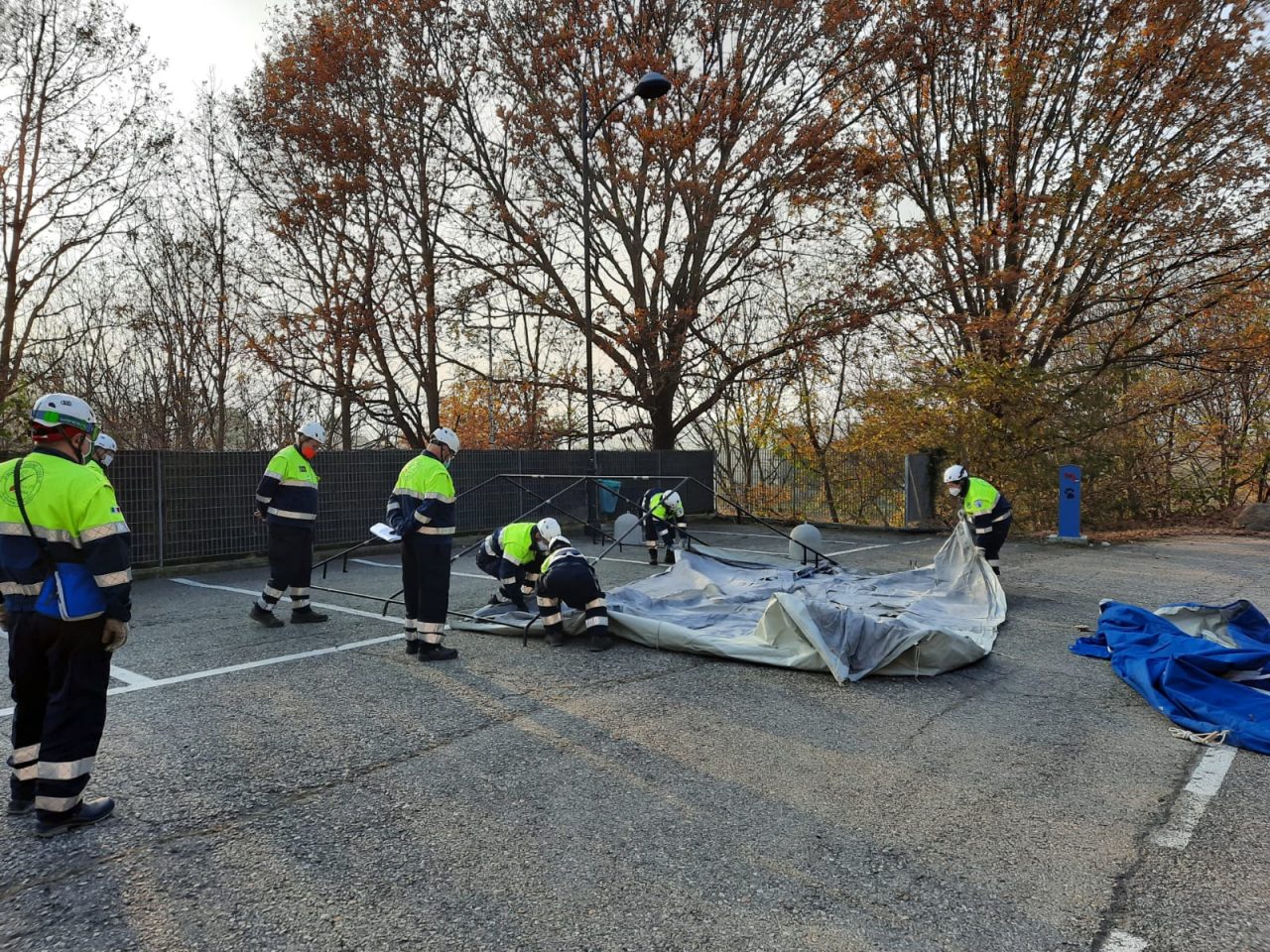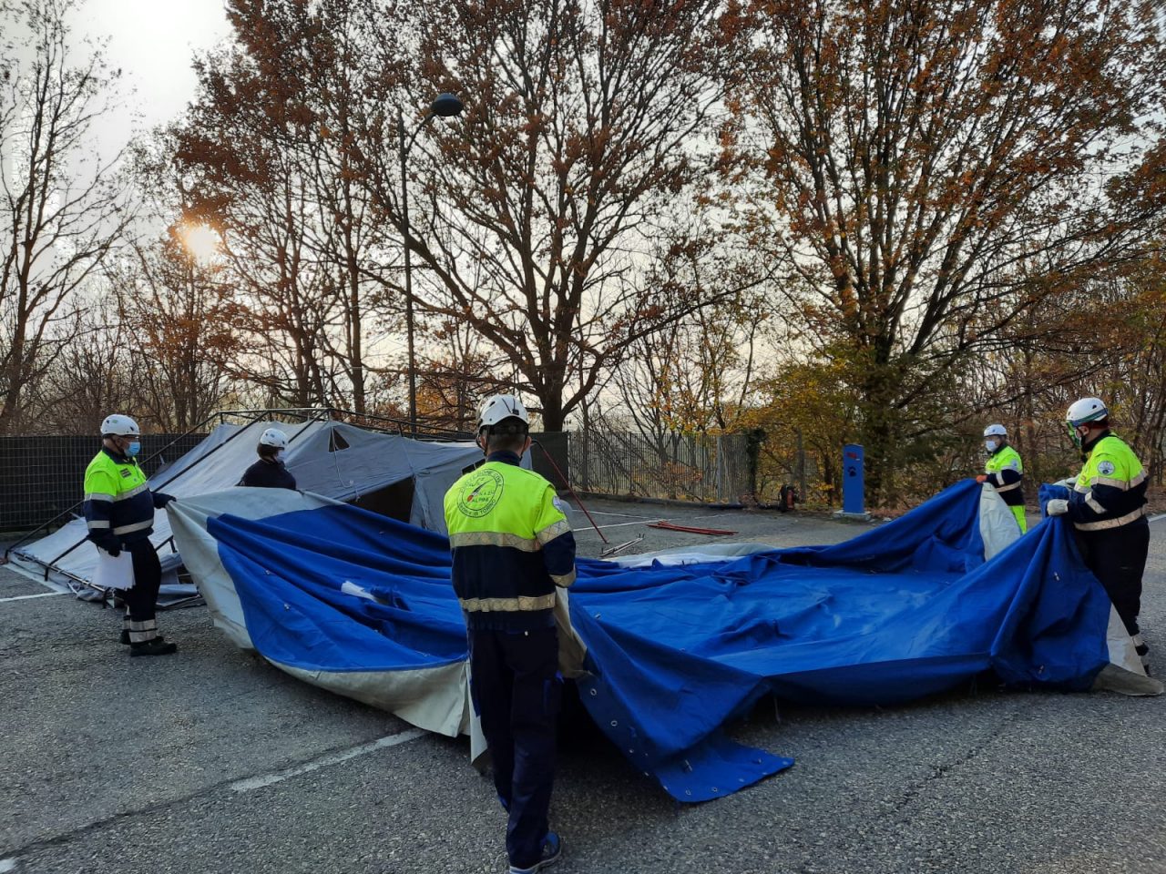 Si sono svolte oggi pomeriggio, sabato 14 novembre 2020,  le operazioni per il montaggio della tensostruttura, posizionata nel piazzale del chiostro di Castiglione, che servira nell’ambito dell’allestimento di una postazione drive through, per l’effettuazione di tamponi rapidi.  Il montaggio è stato a cura del gruppo di Protezione Civile degli alpini di Torino e di Castiglione.