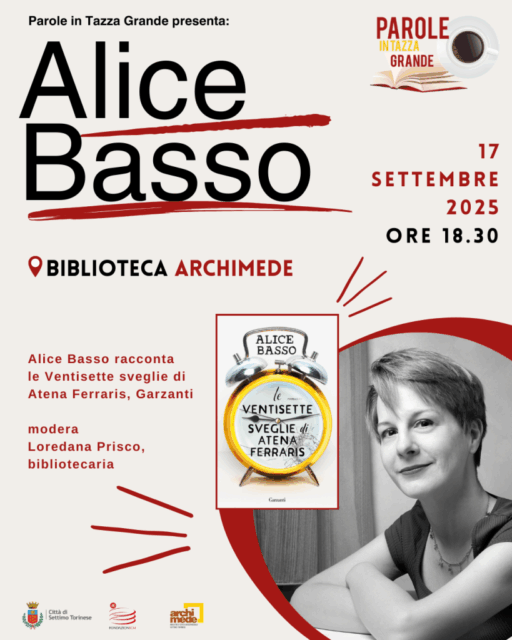 Il primo incontro di settembre vedrà protagonista Alice Basso, che presenterà il suo ultimo libro “Le ventisette sveglie di Atena Ferraris”. Appuntamento mercoledì 17 settembre 2025 alle 18.30 in biblioteca Archimede.