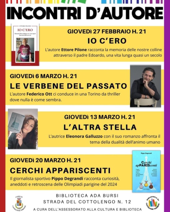 “Incontri d’autore” si conferma un appuntamento imperdibile per gli amanti della lettura e per tutti coloro che desiderano avvicinarsi al mondo della scrittura locale. L’ingresso è gratuito e aperto a tutti. Questi gli appuntamenti seguenti in programma: il 6 marzo Federico Ott presenta “Le verbene del passato”; il 13 marzo Eleonora Galluzzo con “L’altra Stella” e il 20 marzo Pippo Degrandi con “Cerchi appariscenti”.