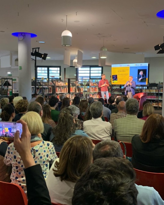 Nel pomeriggio di ieri, giovedì 9 maggio 2024, nell’ambito degli eventi del Salone Off legato al Salone internazionale del libro di Torino, la biblioteca Archimede di Settimo ha avuto il grande piacere di ospitare Giacomo Poretti, artista assoluto dell’ironia e della parola e comico del celebre trio Aldo, Giovanni e Giacomo.