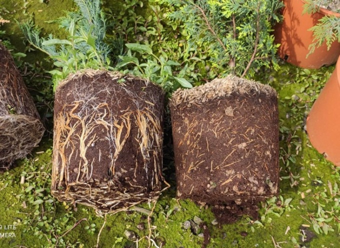 Il confronto radicale di una pianta trattata con Nutrevo (a sinistra) con una coltivata tradizionalmente (a destra)