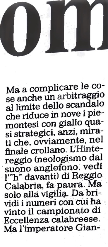 ”… Ma a complicare le cose anche un arbitraggio al limite dello scandalo che riduce in nove i piemontesi con giallo quasi strategici, anzi, mirati che, ovviamente, nel finale crollano”.