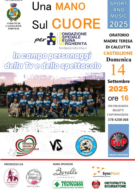 Solidarietà e divertimento si incontrano a Castiglione Torinese con la partita di beneficenza “Una mano sul cuore”, in programma domenica 14 settembre 2025 alle ore 16.00 al campo sportivo dell’Oratorio Madre Teresa di Calcutta.