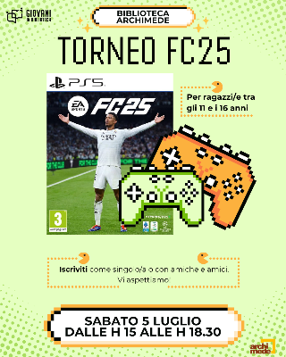 Nella sala Academy della biblioteca Archimede appuntamento con i tornei gaming nell’Academy di Archimede! Sabato 5 Luglio, dalle ore 15.00 alle ore 18.30 si terrà il Torneo di FC25 per ragazzə da 11 a 16 anni. Partecipazione libera su prenotazione compilando il form