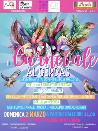 Il Carnevale è dietro l’angolo ed è pronto a fare tappa al Gerbàs! L’appuntamento in programma alla storica cascina situata in strada della Madonnina è previsto per domenica 2 marzo, dalle ore 10.30 alle 18. In arrivo c’è dunque una bellissima festa dedicata ai più piccoli e alle loro famiglie, da vivere insieme. Tante le iniziative che saranno proposte: dai laboratori per bambini allo spettacolo di falconeria con i falconieri «La Torre», passando per giochi vari, animazione, il truccabimbi con emotionart, la presenza della mascotte e parecchio altro ancora. Non mancheranno momenti golosi: alle 16.30 troverà spazio la merenda. Attenzione, è bene specificare che è particolarmente gradita la partecipazione in maschera e che la prenotazione è obbligatoria: è necessario iscriversi entro il 28 febbraio contattando Stefania al 333.9062779.