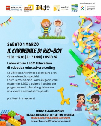 Un Carnevale creativo e coloratissimo con il nuovo laboratorio LEGO Education di robotica educativa e coding rivolto ai bambini tra i 6 e i 7 anni: sabato 1 marzo, dalle 15.30 alle 17.00, in biblioteca Archimede si svolgerà il Carnevale di Rio-Bot: i partecipanti potranno costruire il proprio carro allegorico con tanti mattoncini LEGO. Grazie al coding, si potrà programmare il robot che guiderà il carro e lo farà sfilare in una vivace e coloratissima parata! L’invito è a partecipare in maschera. Costo: 7 €; la prenotazione è obbligatoria scrivendo a: leis.archimede@fondazione-ecm.it.