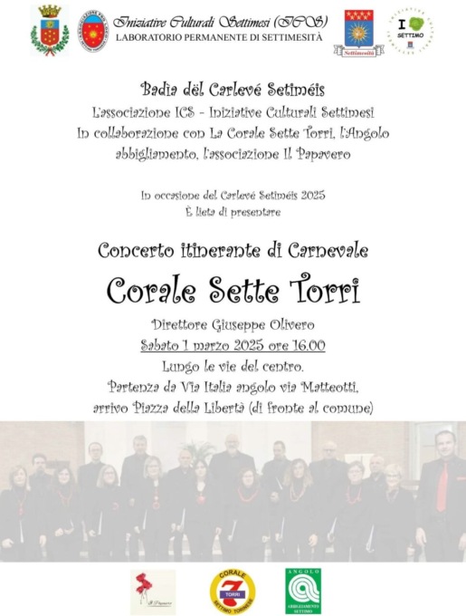 Dopo il successo della grande sfilata di domenica 23 febbraio, proseguono gli appuntamenti del carnevale settimese. Sabato 1 marzo infatti ci sarà il Concerto itinerante di Carnevale, con Iniziative culturali settimesi e la Corale Sette Torri che è diretta dal maestro Giuseppe Olivero (in collaborazione con associazione Il Papavero e l’Angolo Abbigliamento). Partenza alle 16 da via Italia (angolo via Matteotti). Arrivo in piazza della Libertà.