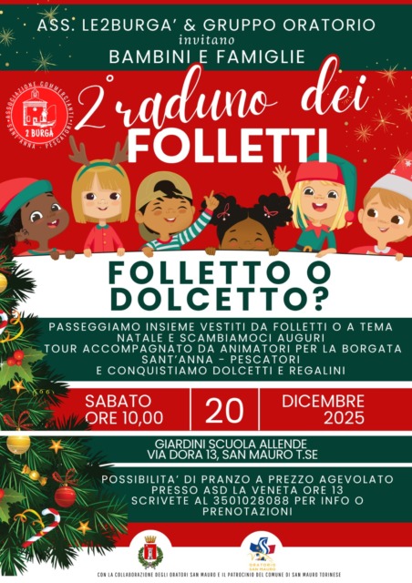 Il Comune di San Mauro Torinese patrocina la seconda edizione del Raduno dei Folletti organizzata dall’associazione Le due Burgà – San Mauro Torinese Sant’Anna – Pescatori in collaborazione con il Gruppo oratorio. Sabato 20 dicembre alle 10, passeggiata con abiti a tema, accompagnati da animatori per un tour della borgata Sant’Anna- Pescatori a caccia di dolcetti e sorprese. Per chi fosse interessato, possibilità di pranzare presso Asd La Veneta. Per info e prenotazioni: 350 1028088.