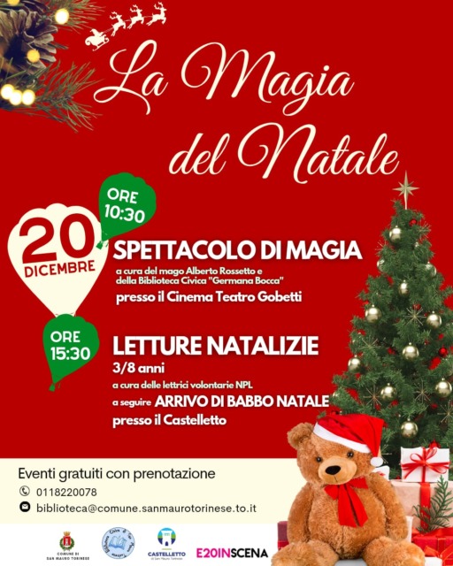 Sabato 20 dicembre, doppio appuntamento per immergersi nell’atmosfera natalizia in città.Alle ore 10,30 ritrovo al Cinema Teatro Gobetti, via Martiri della Libertà 17, per un emozionante spettacolo di magia “Un Natale d’incanto” a cura del maestro Alberto Rossetto e della Biblioteca civica “Germana Bocca”. Alle 15, 30 letture natalizie dedicate alla fascia di età 3-8 anni a cura delle lettrici volontarie del progetto Nati Per Leggere. Una volta terminate le letture è previsto l’arrivo di Babbo Natale al Castelletto di San Mauro Torinese, via Torino 28. Entrambi gli appuntamenti sono gratuiti con prenotazione allo 011 8220078 oppure biblioteca@comune.sanamurotorinese.to.it