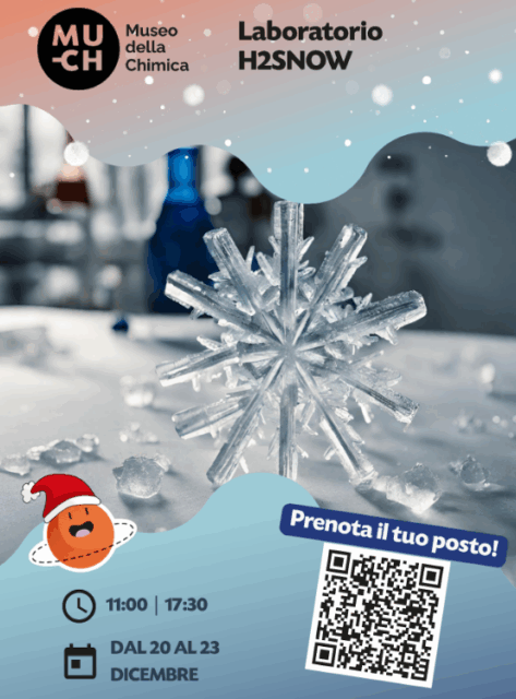 Nel fine settimana di sabato 20 e domenica 21 dicembre, il Mu-Ch Museo della Chimica di Settimo Torinese propone il laboratorio “H₂Snow”, un’attività pensata per avvicinare i più piccoli alla chimica attraverso le suggestioni dell’inverno. Il laboratorio, dedicato a bambini e bambine dai 5 ai 12 anni, si svolgerà in due turni giornalieri, alle 11.00 e alle 17.30, con una durata di 60 minuti. Un’esperienza interattiva che permette di scoprire, in modo divertente e coinvolgente, i fenomeni chimici legati alla stagione più fredda e al clima natalizio. L’attività ha un costo di 9 euro ed è fortemente consigliata la prenotazione, da effettuare tramite la sezione Laboratori del sito del museo. Il pagamento è previsto solo per i partecipanti, mentre gli accompagnatori non sono soggetti al biglietto.