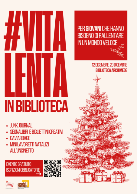 La Biblioteca Archimede di Settimo Torinese ospita #vitalenta in biblioteca, un’iniziativa dedicata ai giovani dai 16 ai 35 anni, pensata per prendersi una pausa dalla routine e ritagliarsi uno spazio di creatività e relax. Gli appuntamenti sono in programma venerdì 12 dicembre dalle 18.30 alle 20.30, sabato 20 dicembre dalle 11 alle 12.30 e sabato 20 dicembre dalle 16 alle 19.30, negli spazi della biblioteca in piazza Campidoglio 50. Durante gli incontri sarà possibile sperimentare diverse attività manuali, dal junk journal ai bigliettini e segnalibri creativi, dal caviardage a piccoli lavoretti natalizi all’uncinetto. La partecipazione è gratuita, con iscrizione obbligatoria tramite modulo online. Per informazioni: info@bibliotecarchimede.it