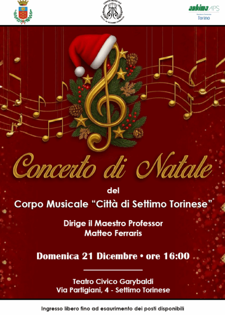 Domenica 21 dicembre, alle 16, al teatro Civico Garybaldi, il Corpo Musicale “Città di Settimo Torinese” invita la cittadinanza al tradizionale Concerto di Natale. Dirige il Maestro Professor Matteo Ferraris. Ingresso libero fino ad esaurimento dei posti disponibili.