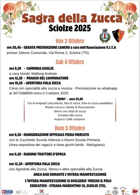 A Sciolze ritorna protagonista la Sagra della Zucca: in arrivo c’è la ventitreesima edizione della tradizionale manifestazione, evento da sempre in grado di portare entusiasmo in paese e nel circondario. L’appuntamento è in programma per la serata di venerdì 3 ottobre, e poi per le giornate di sabato 4 e domenica 5 ottobre.