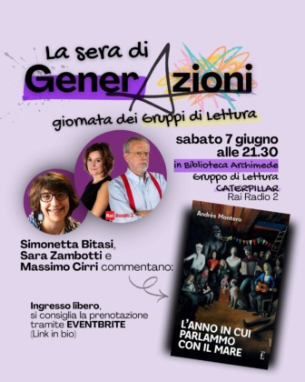 Sera – GDL Caterpillar Rai Radio 2 alla Biblioteca Archimede: alle 21.30, presso la Biblioteca Archimede, è in programma l’incontro con il Gruppo di Lettura Caterpillar Rai Radio 2, insieme a Massimo Cirri, Sara Zambotti e Simonetta Bitasi. Il gruppo discuterà il libro “L’anno in cui parlammo con il mare” di Andrés Montero (Edicola Ediciones, 2024).