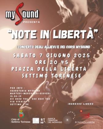 Sabato 7 giugno, alle 20.45 in piazza della Libertà appuntamento con “NOTE IN LIBERTÀ”, concerto allieve/i a cura dell’Associazione mySound. Fiumi di musica dal vivo per fare festa insieme a tutta la città. Sul palco il frutto del lavoro di squadra di Allievi/e e Insegnanti dell’Associazione mySound. Un piccolo grande festival di voci e strumenti per dare vita a una serata imperdibile. Ingresso libero. Per informazioni: 011.80.28.704 – 340.85.01.735 – associazionemysound@gmail.com
