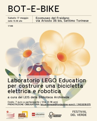 Tra gli appuntamenti del Festival del Verde a Settimo Torinese, sabato 17 maggio spazio alla creatività e alla sostenibilità con “Bot-e-bike”, un laboratorio dedicato a bambine e bambini tra gli 8 e i 10 anni. L’attività, in programma dalle 15.30 presso l’Ecomuseo del Freidano (via Ariosto 36/bis), propone la costruzione di una bicicletta elettrica e robotica utilizzando i kit LEGO Education. Un’occasione per avvicinarsi in modo divertente ai temi dell’innovazione, della mobilità sostenibile e della tecnologia.