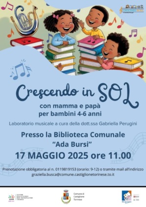 Una mattinata speciale per i più piccoli e le loro famiglie, Sabato 17 maggio alle ore 11, presso la Biblioteca Comunale “Ada Bursi” di Castiglione Torinese, si terrà “Crescendo in SOL”, un laboratorio musicale dedicato ai bambini dai 4 ai 6 anni accompagnati da mamma e papà. L’attività, curata dalla dott.ssa Gabriella Perugini, è pensata per avvicinare i bambini al mondo della musica in modo giocoso e coinvolgente. Posti limitati – Prenotazione obbligatoria: 011 9819153 (ore 9-12); graziella.busca@comune.castiglionetorinese.to.it. Evento promosso dal Comune di Castiglione Torinese in collaborazione con il Sistema Bibliotecario Area Metropolitana Torinese.