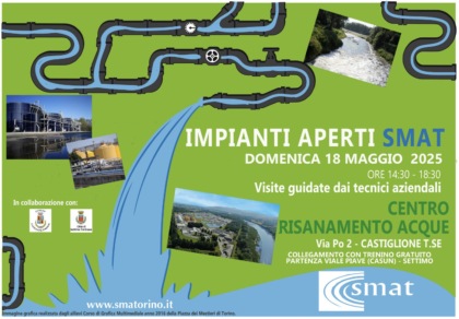 Domenica 18 maggio SMAT aprirà alla cittadinanza il Centro di Risanamento Acque di via Po 2 a Castiglione con visite guidate gratuite dalle ore 14.30 alle 18.30. Un trenino, con partenza da viale Piave a Settimo, permetterà di raggiungere l’impianto. Le visite saranno effettuate a bordo di un secondo trenino alle ore 14.30, 15.30, 16.30 e 17.30. Alla programmazione delle visite saranno abbinati due laboratori per bambini alle ore 15 e alle 17 della durata di circa un’ora ciascuno. INFO QUI.