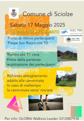 Una passeggiata tra natura, benessere e socialità. Sabato 17 maggio 2025 il Comune di Sciolze, in collaborazione con l’ASL TO4, propone la Camminata del Sabato, un’iniziativa gratuita rivolta a tutta la cittadinanza per promuovere uno stile di vita sano e attivo. Il ritrovo è previsto in Piazza San Rocco alle ore 10, con registrazione dei partecipanti prima della partenza. Il rientro è stimato intorno alle ore 11. È richiesto abbigliamento adeguato alla camminata. In caso di maltempo l’evento sarà rinviato. Per informazioni: Gloria (Walking Leader) 331 2887938. Un’occasione per muoversi insieme, conoscere il territorio e dedicare un’ora al proprio benessere.
