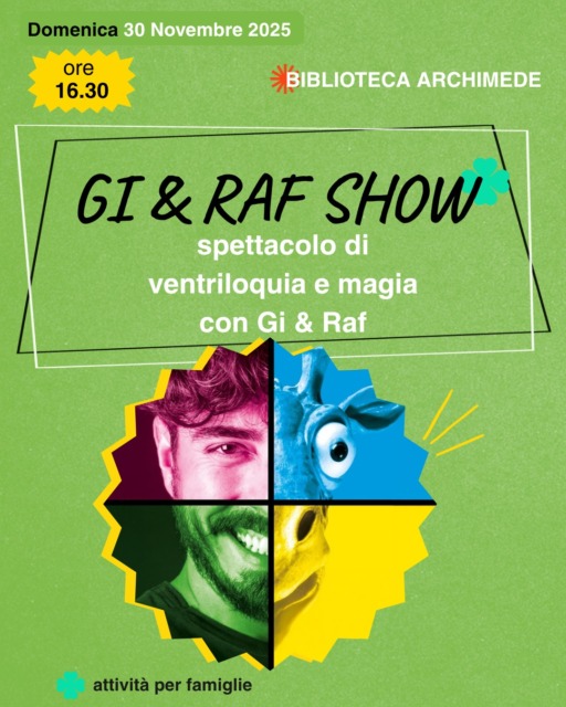 Ore 16.30 – GI & RAF SHOW, spettacolo per famiglie con Gi & Raf. Uno spettacolo di ventriloquia e magie sorprendenti con protagonisti Gi & Raf, una giraffa dispettosa e un mago stralunato. Una coppia irresistibile, la cui capa indiscussa è Gi. Volubile, irriverente, ma anche tenera, ama divertire i bambini e stuzzicare Raf per fargli perdere la pazienza! Già ospiti a “Tú sí que vales” e ai “Soliti Ignoti”, Gi & Raf vi trasporteranno in un mondo di sogni e vi travolgeranno con la loro simpatia!