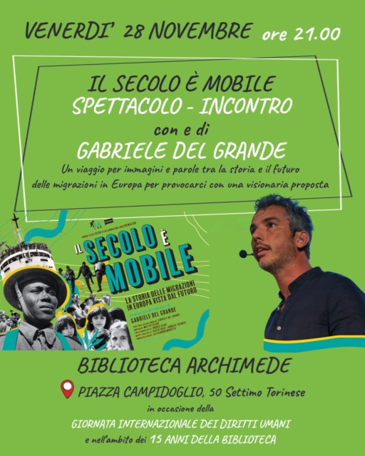 Venerdì 28 novembre, ore 21.00 — Il secolo è mobile, spettacolo-incontro di e con Gabriele Del Grande (prenotazione obbligatoria QUI). Evento a cura del progetto SAI (Sistema accoglienza integrazione), Fondazione ECM e Biblioteca Archimede. Un viaggio per immagini e parole tra la storia e il futuro delle migrazioni in Europa per provocarci con una visionaria proposta. L’autore accompagna il racconto con la proiezione di fotografie e video d’archivio di un intero secolo di storia.